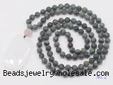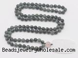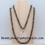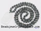 Details: Hand-knotted jasper mala necklaces: 108 8mm/10mm round matte kambaba jasper beads with white crystal pendant/12mm rose quartz guru bead and white crystal pendant (you can choose different pendants, but there will be tiny different in shape & color, we will make the jewelry randomly according to our stock) Item: GMN5123 Material: No.1: 8mm: 108 8mm matte kambaba jasper beads & white crystal pendant 10mm: 108 10mm matte kambaba jasper beads & white crystal pendant No.2: 8mm: 108 8mm matte kambaba jasper beads, 12mm rose quartz guru bead & white crystal pendant 10mm: 108 10mm matte kambaba jasper beads, 12mm rose quartz guru bead & white crystal pendant Color: See image Length (inch): Necklace length: 8mm: approx 37 - 40 inches (Not including guru bead & pendant) 10mm: approx 46 - 50 inches (Not including guru bead & pendant) Quantity Discount Pricing: 1 – 4: None 5 – 49: 95% 50 – 99: 90% 100+: 85% This mala is available in both 8mm and 10mm beads, The listed price is for 1 piece 8mm mala necklace