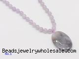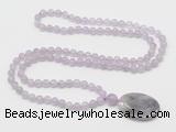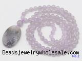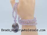 Details: Hand-knotted amethyst mala necklaces: 108 8mm/10mm round lavender amethyst beads with amethyst pendant/12mm guru bead and amethyst pendant (you can choose different pendants, but there will be tiny different in shape & color, we will make the jewelry randomly according to our stock) Item: GMN5147 Material: No.1: 8mm: 108 8mm lavender amethyst beads & amethyst pendant 10mm: 108 10mm lavender amethyst beads & amethyst pendant No.2: 8mm: 108 8mm lavender amethyst beads, 12mm guru bead & amethyst pendant 10mm: 108 10mm lavender amethyst beads, 12mm guru bead & amethyst pendant Color: See image Length (inch): Necklace length: 8mm: approx 37 - 40 inches (Not including guru bead & pendant) 10mm: approx 46 - 50 inches (Not including guru bead & pendant) Pendants: approx 32*47mm Quantity Discount Pricing: 1 - 4: None 5 - 49: 95% 50 - 99: 90% 100+: 85% This mala is available in both 8mm and 10mm beads, The listed price is for 1 piece 8mm mala necklace