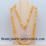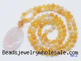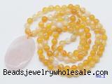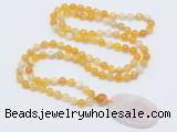 Details: Hand-knotted agate mala necklaces: 108 8mm/10mm round yellow banded agate beads with rose quartz pendant/12mm guru bead and rose quartz pendant (you can choose different pendants, but there will be tiny different in shape & color, we will make the jewelry randomly according to our stock) Item: GMN5150 Material: No.1: 8mm: 108 8mm yellow banded agate beads & rose quartz pendant 10mm: 108 10mm yellow banded agate beads & rose quartz pendant No.2: 8mm: 108 8mm yellow banded agate beads, 12mm guru bead & rose quartz pendant 10mm: 108 10mm yellow banded agate beads, 12mm guru bead & rose quartz pendant Color: See image Length (inch): Necklace length: 8mm: approx 37 - 40 inches (Not including guru bead & pendant) 10mm: approx 46 - 50 inches (Not including guru bead & pendant) Pendants: approx 35*55mm Quantity Discount Pricing: 1 - 4: None 5 - 49: 95% 50 - 99: 90% 100+: 85% This mala is available in both 8mm and 10mm beads, The listed price is for 1 piece 8mm mala necklace
