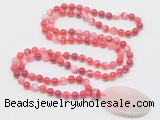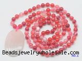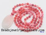 Details: Hand-knotted agate mala necklaces: 108 8mm/10mm round red banded agate beads with rose quartz pendant/12mm guru bead and rose quartz pendant (you can choose different pendants, but there will be tiny different in shape & color, we will make the jewelry randomly according to our stock) Item: GMN5151 Material: No.1: 8mm: 108 8mm red banded agate beads & rose quartz pendant 10mm: 108 10mm red banded agate beads & rose quartz pendant No.2: 8mm: 108 8mm red banded agate beads, 12mm guru bead & rose quartz pendant 10mm: 108 10mm red banded agate beads, 12mm guru bead & rose quartz pendant Color: See image Length (inch): Necklace length: 8mm: approx 37 - 40 inches (Not including guru bead & pendant) 10mm: approx 46 - 50 inches (Not including guru bead & pendant) Pendants: approx 35*55mm Quantity Discount Pricing: 1 - 4: None 5 - 49: 95% 50 - 99: 90% 100+: 85% This mala is available in both 8mm and 10mm beads, The listed price is for 1 piece 8mm mala necklace