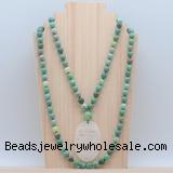 Details: Hand-knotted agate mala necklaces: 108 8mm/10mm round peafowl agate beads with white crystal pendant/12mm guru bead and white crystal pendant (you can choose different pendants, but there will be tiny different in shape & color, we will make the jewelry randomly according to our stock) Item: GMN5158 Material: No.1: 8mm: 108 8mm grass agate beads & white crystal pendant 10mm: 108 10mm grass agate beads & white crystal pendant No.2: 8mm: 108 8mm grass agate beads, 12mm guru bead & white crystal pendant 10mm: 108 10mm grass agate beads, 12mm guru bead & white crystal pendant Color: See image Length (inch): Necklace length: 8mm: approx 37 - 40 inches (Not including guru bead & pendant) 10mm: approx 46 - 50 inches (Not including guru bead & pendant) Pendants: approx 35*55mm Quantity Discount Pricing: 1 - 4: None 5 - 49: 95% 50 - 99: 90% 100+: 85% This mala is available in both 8mm and 10mm beads, The listed price is for 1 piece 8mm mala necklace