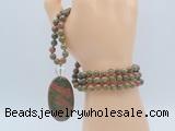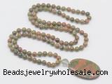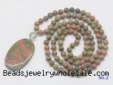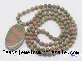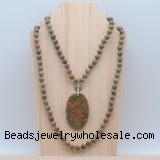 Details: Hand-knotted unakite mala necklaces: 108 8mm/10mm round unakite beads with unakite pendant/12mm white crystal guru bead and unakite pendant (you can choose different pendants, but there will be tiny different in shape & color, we will make the jewelry randomly according to our stock) Item: GMN5170 Material: No.1: 8mm: 108 8mm unakite beads & unakite pendant 10mm: 108 10mm unakite beads & unakite pendant No.2: 8mm: 108 8mm unakite beads, 12mm white crystal guru bead & unakite pendant 10mm: 108 10mm unakite beads, 12mm white crystal guru bead & unakite pendant Color: See image Length (inch): Necklace length: 8mm: approx 37 - 40 inches (Not including guru bead & pendant) 10mm: approx 46 - 50 inches (Not including guru bead & pendant) Pendants: approx 35*55mm Quantity Discount Pricing: 1 - 4: None 5 - 49: 95% 50 - 99: 90% 100+: 85% This mala is available in both 8mm and 10mm beads, The listed price is for 1 piece 8mm mala necklace