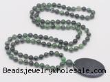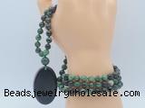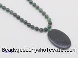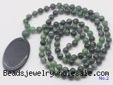 Details: Hand-knotted ruby zoisite mala necklaces: 108 8mm/10mm round ruby zoisite beads with blue goldstone pendant/12mm guru bead and blue goldstone pendant (you can choose different pendants, but there will be tiny different in shape & color, we will make the jewelry randomly according to our stock) Item: GMN5172 Material: No.1: 8mm: 108 8mm ruby zoisite beads & blue goldstone pendant 10mm: 108 10mm ruby zoisite beads & blue goldstone pendant No.2: 8mm: 108 8mm ruby zoisite beads, 12mm guru bead & blue goldstone pendant 10mm: 108 10mm ruby zoisite beads, 12mm guru bead & blue goldstone pendant Color: See image Length (inch): Necklace length: 8mm: approx 37 - 40 inches (Not including guru bead & pendant) 10mm: approx 46 - 50 inches (Not including guru bead & pendant) Pendants: approx 35*55mm Quantity Discount Pricing: 1 - 4: None 5 - 49: 95% 50 - 99: 90% 100+: 85% This mala is available in both 8mm and 10mm beads, The listed price is for 1 piece 8mm mala necklace