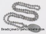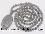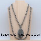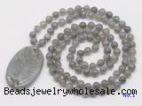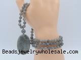Details: Hand-knotted labradorite mala necklaces: 108 8mm/10mm round labradorite beads with labradorite pendant/12mm guru bead and labradorite pendant (you can choose different pendants, but there will be tiny different in shape & color, we will make the jewelry randomly according to our stock) Item: GMN5179 Material: No.1: 8mm: 108 8mm labradorite beads & labradorite pendant 10mm: 108 10mm labradorite beads & labradorite pendant No.2: 8mm: 108 8mm labradorite beads, 12mm guru bead & labradorite pendant 10mm: 108 10mm labradorite beads, 12mm guru bead & labradorite pendant Color: See image Length (inch): Necklace length: 8mm: approx 37 - 40 inches (Not including guru bead & pendant) 10mm: approx 46 - 50 inches (Not including guru bead & pendant) Pendants: approx 35*55mm Quantity Discount Pricing: 1 - 4: None 5 - 49: 95% 50 - 99: 90% 100+: 85% This mala is available in both 8mm and 10mm beads, The listed price is for 1 piece 8mm mala necklace