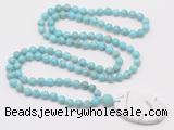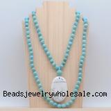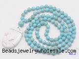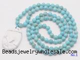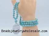 Details: Hand-knotted turquoise mala necklaces: 108 8mm/10mm round blue howlite beads with white howlite pendant/12mm guru bead and white howlite pendant (you can choose different pendants, but there will be tiny different in shape & color, we will make the jewelry randomly according to our stock) Item: GMN5188 Material: No.1: 8mm: 108 8mm blue howlite beads & white howlite pendant 10mm: 108 10mm blue howlite beads & white howlite pendant No.2: 8mm: 108 8mm white howlite beads, 12mm guru bead & white howlite pendant 10mm: 108 10mm white howlite beads, 12mm guru bead & white howlite pendant Color: See image Length (inch): Necklace length: 8mm: approx 37 - 40 inches (Not including guru bead & pendant) 10mm: approx 46 - 50 inches (Not including guru bead & pendant) Pendants: approx 35*55mm Quantity Discount Pricing: 1 - 4: None 5 - 49: 95% 50 - 99: 90% 100+: 85% This mala is available in both 8mm and 10mm beads, The listed price is for 1 piece 8mm mala necklace