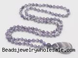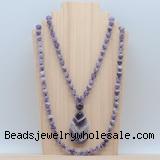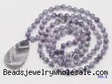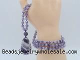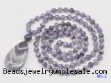 Details: Hand-knotted amethyst mala necklaces: 108 8mm/10mm round dogtooth amethyst beads with amethyst pendant/12mm guru bead and amethyst pendant (you can choose different pendants, but there will be tiny different in shape & color, we will make the jewelry randomly according to our stock) Item: GMN5199 Material: No.1: 8mm: 108 8mm dogtooth amethyst beads & amethyst pendant 10mm: 108 10mm dogtooth amethyst beads & amethyst pendant No.2: 8mm: 108 8mm dogtooth amethyst beads, 12mm guru bead & amethyst pendant 10mm: 108 10mm dogtooth amethyst beads, 12mm guru bead & amethyst pendant Color: See image Length (inch): Necklace length: 8mm: approx 37 - 40 inches (Not including guru bead & pendant) 10mm: approx 46 - 50 inches (Not including guru bead & pendant) Pendants: approx 30*50mm Quantity Discount Pricing: 1 – 4: None 5 – 49: 95% 50 – 99: 90% 100+: 85% This mala is available in both 8mm and 10mm beads, The listed price is for 1 piece 8mm mala necklace