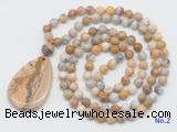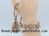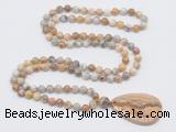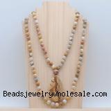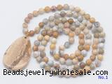 Details: Hand-knotted agate mala necklaces: 108 8mm/10mm round yellow crazy lace agate beads with picture jasper pendant/12mm guru bead and picture jasper pendant (you can choose different pendants, but there will be tiny different in shape & color, we will make the jewelry randomly according to our stock) Item: GMN5208 Material: No.1: 8mm: 108 8mm yellow crazy lace agate beads & picture jasper pendant 10mm: 108 10mm yellow crazy lace agate beads & picture jasper pendant No.2: 8mm: 108 8mm yellow crazy lace agate beads, 12mm guru bead & picture jasper pendant 10mm: 108 10mm yellow crazy lace agate beads, 12mm guru bead & picture jasper pendant Color: See image Length (inch): Necklace length: 8mm: approx 37 - 40 inches (Not including guru bead & pendant) 10mm: approx 46 - 50 inches (Not including guru bead & pendant) Pendants: approx 35*55mm Quantity Discount Pricing: 1 – 4: None 5 – 49: 95% 50 – 99: 90% 100+: 85% This mala is available in both 8mm and 10mm beads, The listed price is for 1 piece 8mm mala necklace
