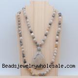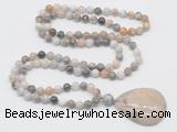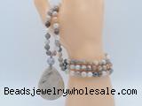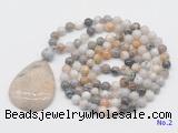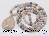 Details: Hand-knotted agate mala necklaces: 108 8mm/10mm round bamboo leaf agate beads with fossil coral pendant/12mm guru bead and fossil coral pendant (you can choose different pendants, but there will be tiny different in shape & color, we will make the jewelry randomly according to our stock) Item: GMN5209 Material: No.1: 8mm: 108 8mm bamboo leaf agate beads & fossil coral pendant 10mm: 108 10mm bamboo leaf agate beads & fossil coral pendant No.2: 8mm: 108 8mm bamboo leaf agate beads, 12mm guru bead & fossil coral pendant 10mm: 108 10mm bamboo leaf agate beads, 12mm guru bead & fossil coral pendant Color: See image Length (inch): Necklace length: 8mm: approx 37 - 40 inches (Not including guru bead & pendant) 10mm: approx 46 - 50 inches (Not including guru bead & pendant) Pendants: approx 40*52mm Quantity Discount Pricing: 1 – 4: None 5 – 49: 95% 50 – 99: 90% 100+: 85% This mala is available in both 8mm and 10mm beads, The listed price is for 1 piece 8mm mala necklace