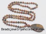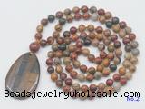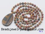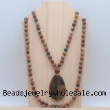 Details: Hand-knotted jasper mala necklaces: 108 8mm/10mm round picasso jasper beads with iron tiger pendant/12mm guru bead and iron tiger pendant (you can choose different pendants, but there will be tiny different in shape & color, we will make the jewelry randomly according to our stock) Item: GMN5222 Material: No.1: 8mm: 108 8mm picasso jasper beads & iron tiger pendant 10mm: 108 10mm picasso jasper beads & iron tiger pendant No.2: 8mm: 108 8mm picasso jasper beads, 12mm guru bead & iron tiger pendant 10mm: 108 10mm picasso jasper beads, 12mm guru bead & iron tiger pendant Color: See image Length (inch): Necklace length: 8mm: approx 37 - 40 inches (Not including guru bead & pendant) 10mm: approx 46 - 50 inches (Not including guru bead & pendant) Pendants: approx 35*55mm Quantity Discount Pricing: 1 – 4: None 5 – 49: 95% 50 – 99: 90% 100+: 85% This mala is available in both 8mm and 10mm beads, The listed price is for 1 piece 8mm mala necklace