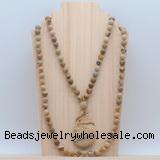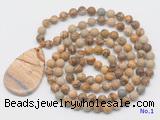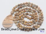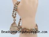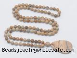 Details: Hand-knotted jasper mala necklaces: 108 8mm/10mm round picture jasper beads with picture jasper pendant/12mm guru bead and picture jasper pendant (you can choose different pendants, but there will be tiny different in shape & color, we will make the jewelry randomly according to our stock) Item: GMN5223 Material: No.1: 8mm: 108 8mm picture jasper beads & picture jasper pendant 10mm: 108 10mm picture jasper beads & picture jasper pendant No.2: 8mm: 108 8mm picture jasper beads, 12mm guru bead & picture jasper pendant 10mm: 108 10mm picture jasper beads, 12mm guru bead & picture jasper pendant Color: See image Length (inch): Necklace length: 8mm: approx 37 - 40 inches (Not including guru bead & pendant) 10mm: approx 46 - 50 inches (Not including guru bead & pendant) Pendants: approx 35*55mm Quantity Discount Pricing: 1 – 4: None 5 – 49: 95% 50 – 99: 90% 100+: 85% This mala is available in both 8mm and 10mm beads, The listed price is for 1 piece 8mm mala necklace