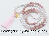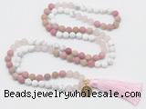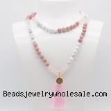 Details: Hand-knotted white howlite mala necklaces: 108 8mm/10mm round matte white howlite, matte pink wooden jasper & matte rose quartz beads with tassel & charm (you can choose different tassel & charm) Item: GMN6204 Material: No.1(8mm: matte white howlite, matte pink wooden jasper, matte rose quartz beads And tassel & charm No.2(10mm: matte white howlite, matte pink wooden jasper, matte rose quartz beads And tassel & charm Color: See image Length (inch): Necklace length: 8mm: approx 37 - 40 inches (Not including tassel & charm) 10mm: approx 46 - 50 inches (Not including tassel & charm) Quantity Discount Pricing: 1 – 4: None 5 – 49: 95% 50 – 99: 90% 100+: 85% This mala is available in both 8mm and 10mm beads, The listed price is for 1 piece 8mm mala necklace