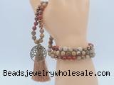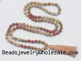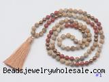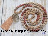 Details: Hand-knotted jasper mala necklaces: 108 8mm/10mm round matte picture jasper, red jasper & plated hematite beads with tassel/tassel & alloy charm (you can choose different tassel & charm) Item: GMN6246 Material: No.1: 8mm/10mm matte picture jasper, red jasper, plated hematite beads And tassel No.2: 8mm/10mm matte picture jasper, red jasper, plated hematite beads And tassel & charm Color: See image Length (inch): Necklace length: 8mm: approx 37 - 40 inches (Not including tassel) 10mm: approx 46 - 50 inches (Not including tassel) Quantity Discount Pricing: 1 – 4: None 5 – 49: 95% 50 – 99: 90% 100+: 85% This mala is available in both 8mm and 10mm beads, The listed price is for 1 piece 8mm mala necklace