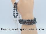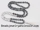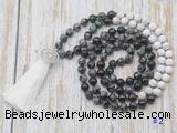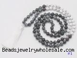 Details: Hand-knotted obsidian mala necklaces: 108 8mm/10mm round snowflake obsidian, garnet & matte white howlite beads with tassel/tassel & alloy charm (you can choose different tassel & charm) Item: GMN6259 Material: No.1: 8mm/10mm snowflake obsidian, garnet, matte white howlite beads And tassel No.2: 8mm/10mm snowflake obsidian, garnet, matte white howlite beads And tassel & charm Color: See image Length (inch): Necklace length: 8mm: approx 37 - 40 inches (Not including tassel) 10mm: approx 46 - 50 inches (Not including tassel) Quantity Discount Pricing: 1 – 4: None 5 – 49: 95% 50 – 99: 90% 100+: 85% This mala is available in both 8mm and 10mm beads, The listed price is for 1 piece 8mm mala necklace