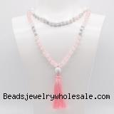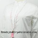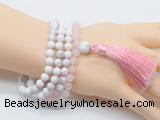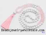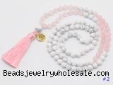 Details: Hand-knotted white howlite mala necklaces: 108 8mm/10mm round rose quartz, matte white howlite beads & 12mm matte white howlite guru bead with tassel/tassel & charm (you can choose different tassel & charm) Item: GMN6302 Material: No.1: 8mm/10mm: rose quartz, matte white howlite beads, 12mm matte white howlite guru bead And tassel No.2: 8mm/10mm: rose quartz, matte white howlite beads, 12mm matte white howlite guru bead And tassel & charm Color: See image Length (inch): Necklace length: 8mm: approx 37 - 40 inches (Not including guru bead & tassel) 10mm: approx 46 - 50 inches (Not including guru bead & tassel) Quantity Discount Pricing: 1 – 4: None 5 – 49: 95% 50 – 99: 90% 100+: 85% This mala is available in both 8mm and 10mm beads, The listed price is for 1 piece 8mm mala necklace