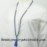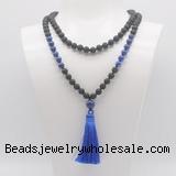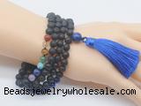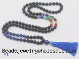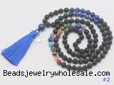 Details: Hand-knotted 7 Chakra mala necklaces: 108 8mm/10mm round black lava, lapis lazuli, 7 chakra beads & 12mm lapis lazuli guru bead with tassel & charm (you can choose different tassel & charm) Item: GMN6328 Material: No.1: 8mm/10mm: black lava, lapis lazuli, 7 chakra beads, 12mm lapis lazuli guru bead And tassel No.2: 8mm/10mm: black lava, lapis lazuli, 7 chakra beads, 12mm lapis lazuli guru bead And tassel & charm Color: See image Length (inch): Necklace length: 8mm: approx 37 - 40 inches (Not including guru bead & tassel) 10mm: approx 46 - 50 inches (Not including guru bead & tassel) Quantity Discount Pricing: 1 – 4: None 5 – 49: 95% 50 – 99: 90% 100+: 85% This mala is available in both 8mm and 10mm beads, The listed price is for 1 piece 8mm mala necklace
