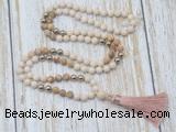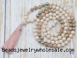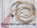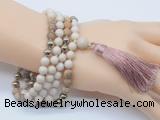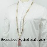 Details: Hand-knotted jasper mala necklaces: 108 8mm/10mm round matte white fossil jasper, matte picture jasper, plated hematite beads & 12mm white fossil jasper guru bead with tassel/tassel & alloy charm (you can choose different tassel & charm) Item: GMN6345 Material: No.1: 8mm/10mm white fossil jasper, matte picture jasper, plated hematite beads, 12mm white fossil jasper guru bead And tassel No.2: 8mm/10mm white fossil jasper, matte picture jasper, plated hematite beads, 12mm white fossil jasper guru bead And tassel & charm Color: See image Length (inch): Necklace length: 8mm: approx 37 - 40 inches (Not including guru bead & tassel) 10mm: approx 46 - 50 inches (Not including guru bead & tassel) Quantity Discount Pricing: 1 – 4: None 5 – 49: 95% 50 – 99: 90% 100+: 85% This mala is available in both 8mm and 10mm beads, The listed price is for 1 piece 8mm mala necklace
