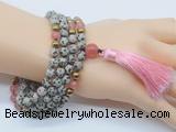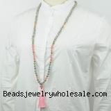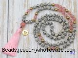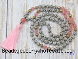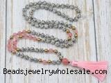 Details: Hand-knotted jasper mala necklaces: 108 8mm/10mm round dalmatian jasper, cherry quartz, plated hematite beads & 12mm cherry quartz guru bead with tassel/tassel & alloy charm (you can choose different tassel & charm) Item: GMN6347 Material: No.1: 8mm/10mm dalmatian jasper, cherry quartz, plated hematite beads, 12mm cherry quartz guru bead And tassel No.2: 8mm/10mm dalmatian jasper, cherry quartz, plated hematite beads, 12mm cherry quartz guru bead And tassel & charm Color: See image Length (inch): Necklace length: 8mm: approx 37 - 40 inches (Not including guru bead & tassel) 10mm: approx 46 - 50 inches (Not including guru bead & tassel) Quantity Discount Pricing: 1 – 4: None 5 – 49: 95% 50 – 99: 90% 100+: 85% This mala is available in both 8mm and 10mm beads, The listed price is for 1 piece 8mm mala necklace
