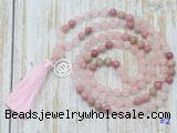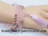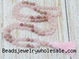 Details: Hand-knotted quartz mala necklaces: 108 8mm/10mm round rose quartz & pink wooden jasper beads & 12mm faceted rose quartz guru bead with tassel/tassel & alloy charm (you can choose different tassel & charm) Item: GMN6351 Material: No.1: 8mm/10mm rose quartz, pink wooden jasper beads, 12mm faceted rose quartz guru bead And tassel No.2: 8mm/10mm rose quartz, pink wooden jasper beads, 12mm faceted rose quartz guru bead And tassel & charm Color: See image Length (inch): Necklace length: 8mm: approx 37 - 40 inches (Not including guru bead & tassel) 10mm: approx 46 - 50 inches (Not including guru bead & tassel) Quantity Discount Pricing: 1 – 4: None 5 – 49: 95% 50 – 99: 90% 100+: 85% This mala is available in both 8mm and 10mm beads, The listed price is for 1 piece 8mm mala necklace