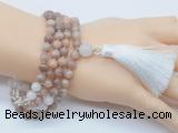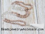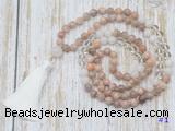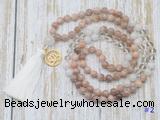Details: Hand-knotted sunstone mala necklaces: 108 8mm/10mm round sunstone, white crystal, white jade beads & 12mm white jade guru bead with tassel/tassel & alloy charm (you can choose different tassel & charm) Item: GMN6354 Material: No.1: 8mm/10mm sunstone, white crystal, white jade beads, 12mm white jade guru bead And tassel No.2: 8mm/10mm sunstone, white crystal, white jade beads, 12mm white jade guru bead And tassel & charm Color: See image Length (inch): Necklace length: 8mm: approx 37 - 40 inches (Not including guru bead & tassel) 10mm: approx 46 - 50 inches (Not including guru bead & tassel) Quantity Discount Pricing: 1 – 4: None 5 – 49: 95% 50 – 99: 90% 100+: 85% This mala is available in both 8mm and 10mm beads, The listed price is for 1 piece 8mm mala necklace