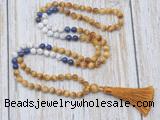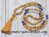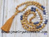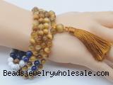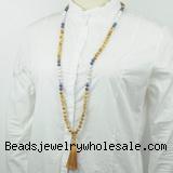 Details: Hand-knotted tiger eye mala necklaces: 108 8mm/10mm round golden tiger eye, lapis lazuli, matte white howlite beads & 12mm golden tiger eye guru bead with tassel/tassel & alloy charm (you can choose different tassel & charm) Item: GMN6357 Material: No.1: 8mm/10mm golden tiger eye, lapis lazuli, matte white howlite beads, 12mm golden tiger eye guru bead And tassel No.2: 8mm/10mm golden tiger eye, lapis lazuli, matte white howlite beads, 12mm golden tiger eye guru bead And tassel & charm Color: See image Length (inch): Necklace length: 8mm: approx 37 - 40 inches (Not including guru bead & tassel) 10mm: approx 46 - 50 inches (Not including guru bead & tassel) Quantity Discount Pricing: 1 – 4: None 5 – 49: 95% 50 – 99: 90% 100+: 85% This mala is available in both 8mm and 10mm beads, The listed price is for 1 piece 8mm mala necklace