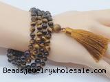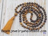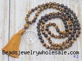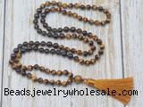 Details: Hand-knotted tiger eye mala necklaces: 108 8mm/10mm round yellow tiger eye, garnet, smoky quartz beads & 12mm yellow tiger eye guru bead with tassel/tassel & alloy charm (you can choose different tassel & charm) Item: GMN6358 Material: No.1: 8mm/10mm yellow tiger eye, garnet, smoky quartz beads, 12mm yellow tiger eye guru bead And tassel No.2: 8mm/10mm yellow tiger eye, garnet, smoky quartz beads, 12mm yellow tiger eye guru bead And tassel & charm Color: See image Length (inch): Necklace length: 8mm: approx 37 - 40 inches (Not including guru bead & tassel) 10mm: approx 46 - 50 inches (Not including guru bead & tassel) Quantity Discount Pricing: 1 – 4: None 5 – 49: 95% 50 – 99: 90% 100+: 85% This mala is available in both 8mm and 10mm beads, The listed price is for 1 piece 8mm mala necklace