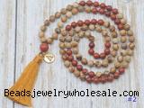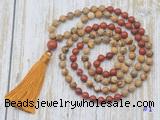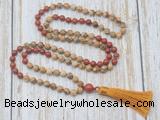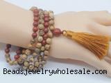 Details: Hand-knotted jasper mala necklaces: 108 8mm/10mm round picture jasper, red jasper beads & 12mm red jasper guru bead with tassel/tassel & alloy charm (you can choose different tassel & charm) Item: GMN6360 Material: No.1: 8mm/10mm picture jasper, red jasper beads, 12mm red jasper guru bead And tassel No.2: 8mm/10mm picture jasper, red jasper beads, 12mm red jasper guru bead And tassel & charm Color: See image Length (inch): Necklace length: 8mm: approx 37 - 40 inches (Not including guru bead & tassel) 10mm: approx 46 - 50 inches (Not including guru bead & tassel) Quantity Discount Pricing: 1 – 4: None 5 – 49: 95% 50 – 99: 90% 100+: 85% This mala is available in both 8mm and 10mm beads, The listed price is for 1 piece 8mm mala necklace