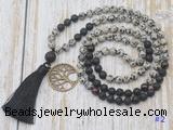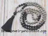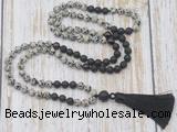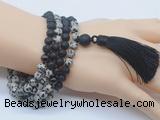 Details: Hand-knotted jasper mala necklaces: 108 8mm/10mm round dalmatian jasper, black lava, garnet beads 12mm black lava guru bead with tassel/tassel & alloy charm (you can choose different tassel & charm) Item: GMN6365 Material: No.1: 8mm/10mm dalmatian jasper, black lava, garnet beads, 12mm black lava guru bead And tassel No.2: 8mm/10mm dalmatian jasper, black lava, garnet beads, 12mm black lava guru bead And tassel & charm Color: See image Length (inch): Necklace length: 8mm: approx 37 - 40 inches (Not including guru bead & tassel) 10mm: approx 46 - 50 inches (Not including guru bead & tassel) Quantity Discount Pricing: 1 – 4: None 5 – 49: 95% 50 – 99: 90% 100+: 85% This mala is available in both 8mm and 10mm beads, The listed price is for 1 piece 8mm mala necklace
