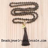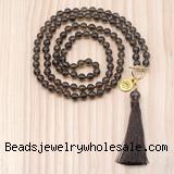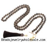 Details: Hand-knotted quartz mala necklaces: 8mm round smoky quartz gemstone beaded necklace finished with OT clasp, alloy charm, lobster clasp, 12mm smoky quartz guru bead & satin tassel (Style No.4) (You can choose different style)