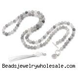 Details: Hand-knotted quartz mala necklaces: 8mm round cloudy quartz gemstone beaded necklace finished with OT clasp, alloy charm, lobster clasp, 12mm cloudy quartz guru bead & satin tassel (Style No.4) (You can choose different style)