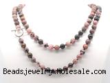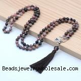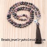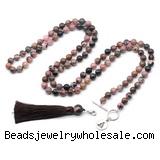 Details: Hand-knotted gemstone mala necklaces: 8mm round rhodonite gemstone beaded necklace finished with OT clasp, alloy charm, lobster clasp, 12mm rhodonite guru bead & satin tassel (Style No.4) (You can choose different style)