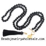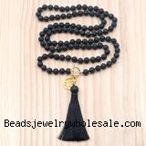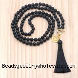 Details: Hand-knotted gemstone mala necklaces: 8mm round black lava gemstone beaded necklace finished with OT clasp, alloy charm, lobster clasp, 12mm black lava guru bead & satin tassel (Style No.4) (You can choose different style)