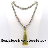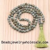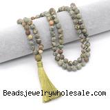 Details: Hand-knotted gemstone mala necklaces: 27/54/108 8mm/10mm round matte rhyolite beads & 12mm matte rhyolite guru bead with satin tassel