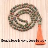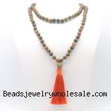 Details: Hand-knotted gemstone mala necklaces: 27/54/108 8mm/10mm round matte unakite beads & 12mm matte unakite guru bead with satin tassel