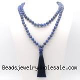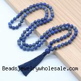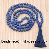 Details: Hand-knotted gemstone mala necklaces: 27/54/108 8mm/10mm round matte lapis lazuli beads & 12mm matte lapis lazuli guru bead with satin tassel