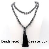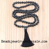 Details: Hand-knotted gemstone mala necklaces: 27/54/108 8mm/10mm round matte black labradorite beads & 12mm matte black labradorite guru bead with satin tassel