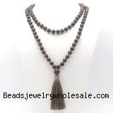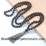 Details: Hand-knotted gemstone mala necklaces: 27/54/108 8mm/10mm round matte bronzite beads & 12mm matte bronzite guru bead with satin tassel