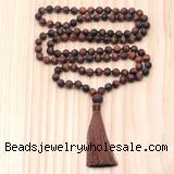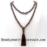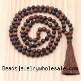 Details: Hand-knotted gemstone mala necklaces: 27/54/108 8mm/10mm round matte red tiger eye beads & 12mm matte red tiger eye guru bead with satin tassel