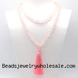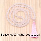 Details: Hand-knotted gemstone mala necklaces: 27/54/108 8mm/10mm round matte rose quartz beads & 12mm matte rose quartz guru bead with satin tassel