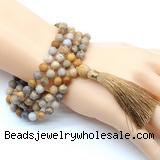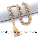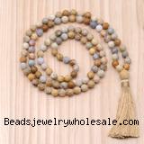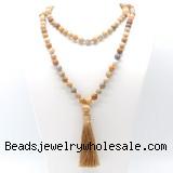 Details: Hand-knotted agate mala necklaces: 27/54/108 8mm/10mm round matte yellow fossil coral beads & 12mm matte fossil coral guru bead with satin tassel