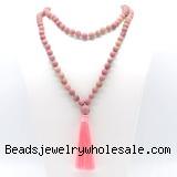 Details: Hand-knotted jasper mala necklaces: 27/54/108 8mm/10mm round matte pink wooden jasper beads & 12mm matte pink wooden jasper guru bead with satin tassel