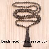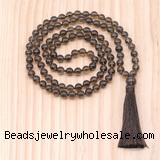 Details: Hand-knotted quartz mala necklaces: 27/54/108 8mm/10mm round smoky quartz beads & 12mm smoky quartz guru bead with satin tassel