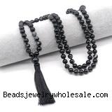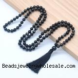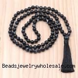 Details: Hand-knotted agate mala necklaces: 27/54/108 8mm/10mm round black banded agate beads & 12mm banded agate guru bead with satin tassel