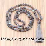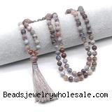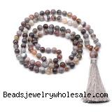 Details: Hand-knotted agate mala necklaces: 27/54/108 8mm/10mm round Botswana agate beads & 12mm Botswana agate guru bead with satin tassel