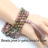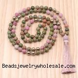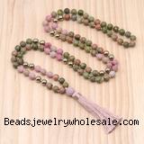Material: 8mm/10mm matte unakite, matte pink wooden jasper, plated hematite beads, 12mm matte pink wooden jasper guru bead, tassel & No.72 jade thread [you can choose different guru bead(style) & tassel]