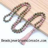 Details: Hand-knotted gemstone mala necklaces: 108 8mm/10mm round matte unakite, matte pink wooden jasper, plated hematite & 12mm matte pink wooden jasper guru bead with satin tassel
