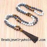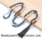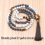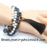 Material: 8mm/10mm matte white howlite, matte black labradorite, yellow tiger eye beads, 12mm yellow tiger eye guru bead, tassel & No.72 jade thread [you can choose different guru bead(style) & tassel]
